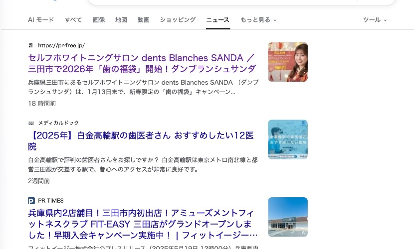 「三田 ホワイトニング」のGoogleニュース検索でトップに掲載されました。